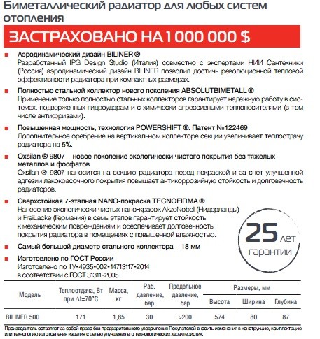 - Разработанный IPGDesignStudio (Италия) совместно с экспертами НИИ Сантехники (Россия) аэродинамический дизайн BILINER позволил достичь революционной тепловой эффективности радиатора при компактных размерах.