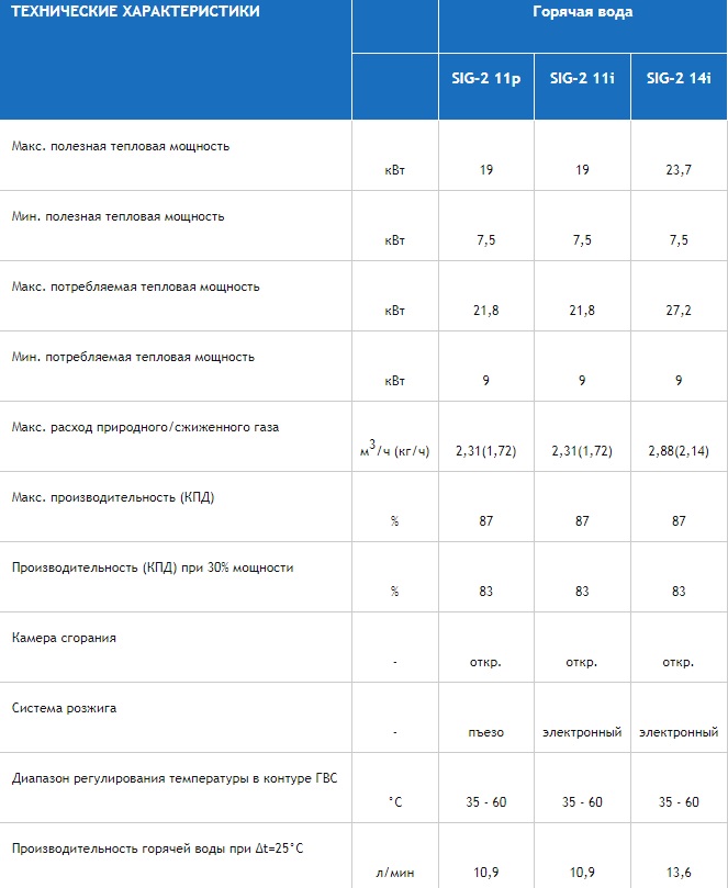- Пьезоэлектрическое зажигание с пилотным пламенем (SIG-2 11p, SIG-2 14p);